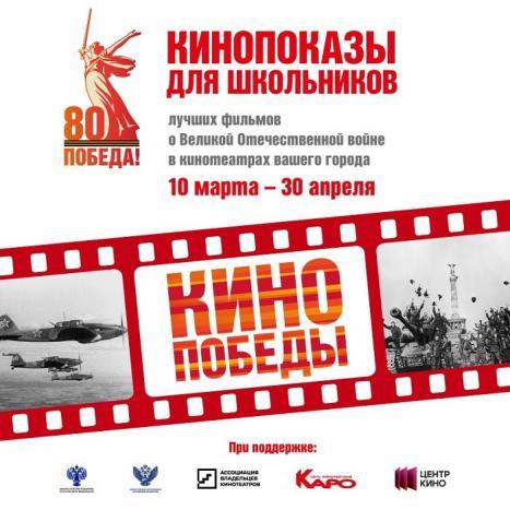 Акция «Кино Победы» - совместный проект Министерства культуры РФ и Министерства просвещения РФ. В рамках акции школьники до 30 апреля смогут бесплатно посмотреть в кинотеатрах 15 художественных и документальных фильмов о Великой Отечественной войне. Среди предлагаемых к просмотру картин – легендарные советские киноленты «А зори здесь тихие», «Летят журавли», «Офицеры», «Они сражались за Родину», «Белорусский вокзал», «Баллада о солдате» и другие. Также зрителям покажут современные фильмы, например, «Битва за Севастополь» и «28 панфиловцев».