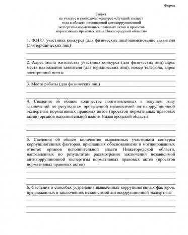 Конкурс проводится в три этапа: прием заявок, оценка и подведение итогов. Заявки принимаются в течение 15 дней на бумажном носителе по адресу: 603082, Нижний Новгород, Кремль, корпус 14 или в форме электронного документа по адресу: anticor@nobl.ru. При направлении заявки в форме электронного документа в строке «Тема» электронного письма должно быть указано «Конкурс экспертов».