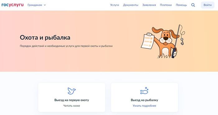 На сайте прописан порядок действий, а также указаны необходимые ссылки на госуслуги для первой охоты и рыбалки. Среди услуг, например, – получение разрешения на добычу охотничьих ресурсов.