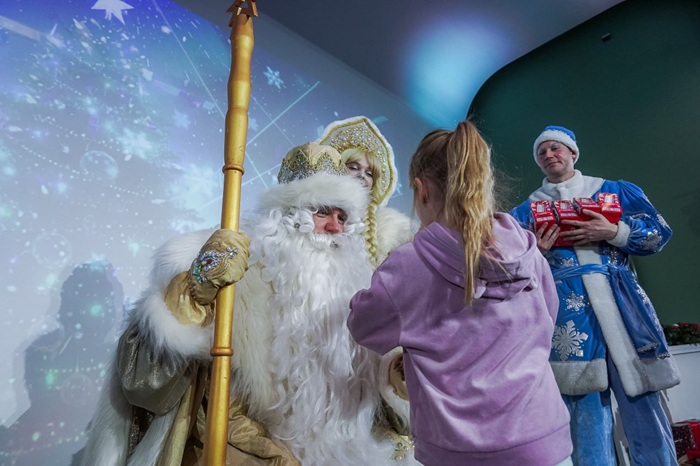 Для ребят было организовано яркое праздничное представление. Вместе со сказочными персонажами дети участвовали в интерактивном спектакле, танцевали, помогали героям искать главного злодея, удивлялись фокусам и веселились от души. Все получили подарки от Деда Мороза и Снегурочки.