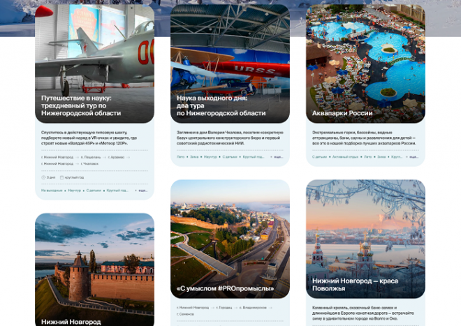 Как сообщили в областном министерстве туризма и промыслов, сейчас на портале доступно шесть тематических маршрутов по региону. В частности, какие-то из них посвящены прогулкам по Нижнему Новгороду, другие – поездкам в Чкаловск, Арзамас, Городец, Семенов и другие населенные пункты региона. Гости могут погрузиться в достижения нижегородской культуры и науки, ознакомиться с местными народными художественными промыслами, изучить контрасты между историей с современностью.