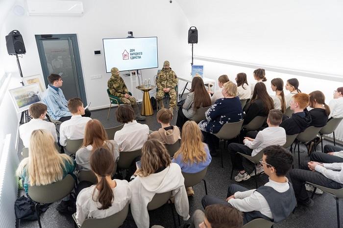 Нижегородские школьники встретились с участниками СВО накануне Дня защитника Отечества в Доме народного единства. Дивизионный инструктор по тактической медицине с позывным «Ангел» и десантник-штурмовик с позывным «Гарри» приехали в родной город в отпуск из зоны боевых действий. Военнослужащие рассказали старшеклассникам о боевых буднях, о подвигах, которые ежедневно совершают наши бойцы.