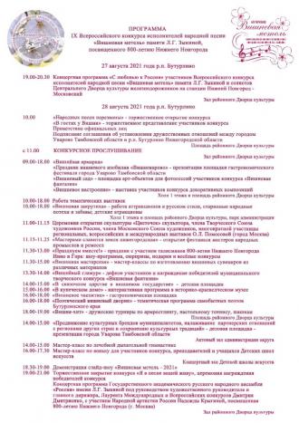 Основные мероприятия «Вишневой метели» состоятся 28 августа и начнутся в 10.00 с парада участников конкурса на площади районного Дворца культуры в р.п. Бутурлино. С 10.30 в зрительном зале районного Дворца культуры начнется конкурсное прослушивание коллективов и солистов.