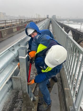 В настоящее время на правой половине проезжей части в пролетах 1-13 и 36-66 опор подрядчик выполняет работы по устройству деформационных швов и демонтажу старого выравнивающего слоя. В пролете 13-17 опор ведутся работы по устройству монолитного парапета.