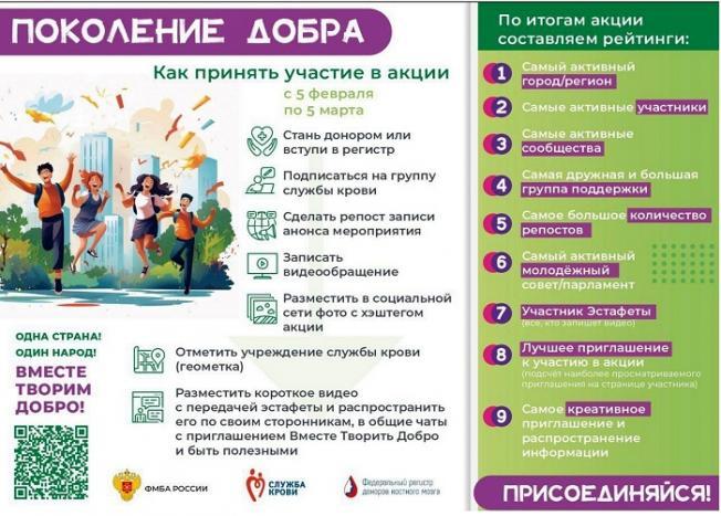 В своих публикациях участники смогут передать эстафету добра и пригласить на донацию молодежные сообщества региона. По итогам акций самые активные молодежные коллективы поощрят памятными подарками.